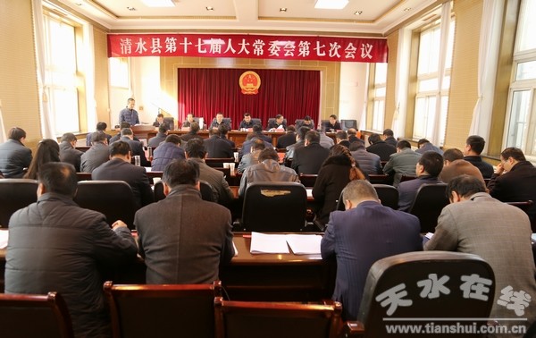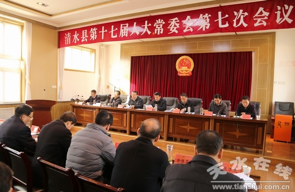 11月30日,清水縣人大常委會主任周偉東主持召開第十七屆人大常委會第七次會議?h人大常委會副主任趙愛平、畢德祥、劉志偉、周建新及縣人大常委會委員出席會議?h人民政府副縣長王懷珍,縣法院、檢察院、政府辦、發(fā)改局、財政局、審計局、監(jiān)察局、公安局、司法局、縣政府法制辦、食藥監(jiān)局、民政局、國稅局、地稅局、非稅局主要負(fù)責(zé)人;松樹、郭川、新城三鄉(xiāng)鎮(zhèn)人大主席及市縣人大代表列席會議。