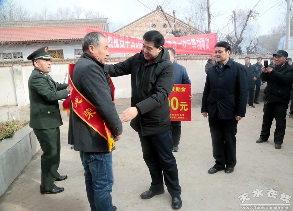 2月2日上午,市人大常委會副主任、清水縣委書記劉天波,縣人大常委會主任周偉東,縣委常委、縣人武部部長張玉賢帶領縣直有關部門負責人前往白沙鎮(zhèn)魯溝村,看望慰問多次立功受獎的武警戰(zhàn)士牛云濤的父母,感謝他們?yōu)椴筷犦斔土藘?yōu)秀人才,祝愿他們歡度春節(jié),合家歡樂。