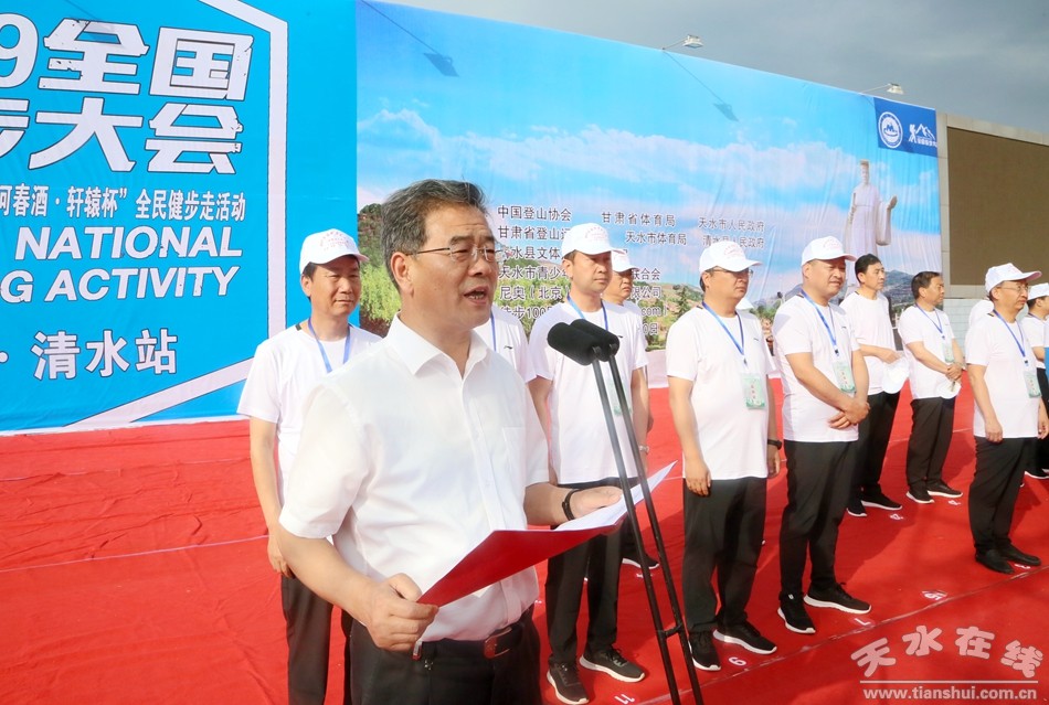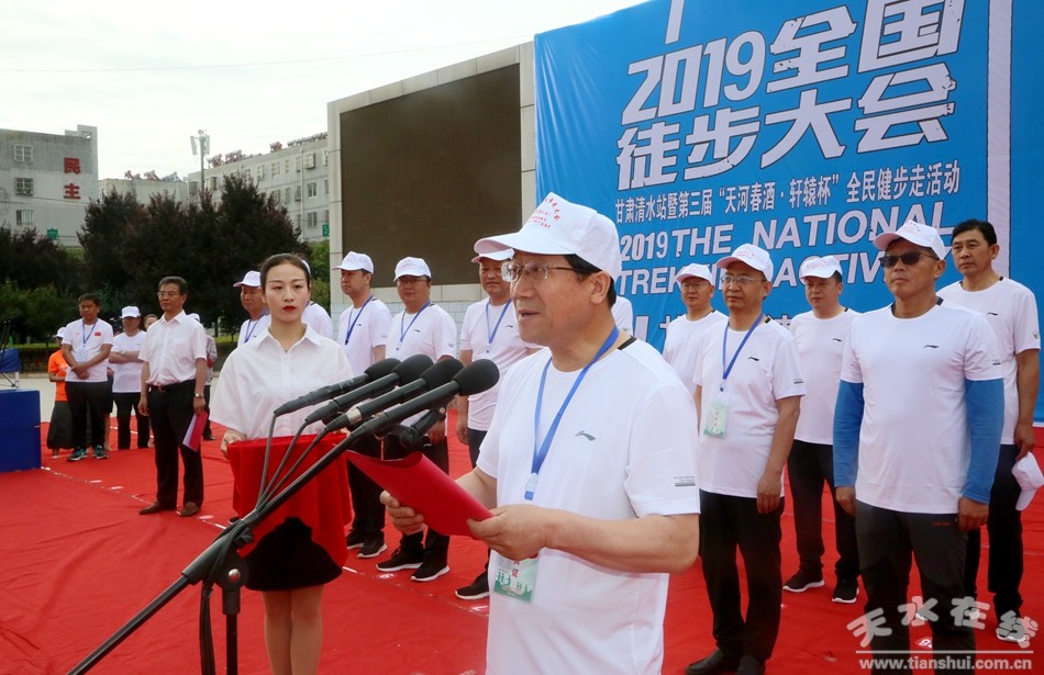 (天水市人大常委會(huì)副主任蒲朝暉宣布2019年全國徒步大會(huì)甘肅清水站暨第三屆“天河春酒+軒轅杯”全民健步走活動(dòng)啟動(dòng)。)