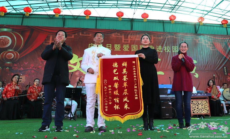 活動(dòng)中,縣五中負(fù)責(zé)人代表五中全體師生為老年大學(xué)贈(zèng)送錦旗一面。