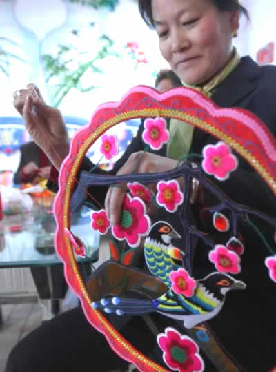 一位婦女在繡制名為「喜上枝頭」的香包刺繡工藝品