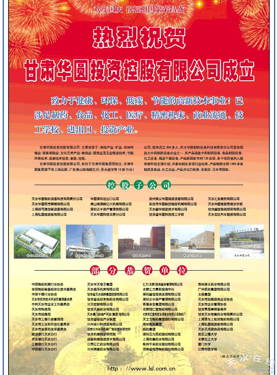 甘肅華圓投資控股有限公司旗下16家子公司,分布于北京、上海、廣州等城市。公司致力于健康、環(huán)保、低碳、節(jié)能等高新技術(shù)事業(yè),已涉足制藥、食品、化工、醫(yī)療、精密機(jī)床、商業(yè)流通、技工學(xué)校、進(jìn)出口、投資產(chǎn)業(yè)。