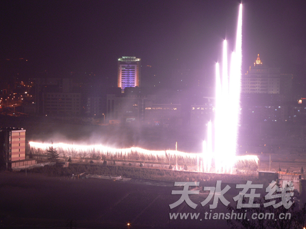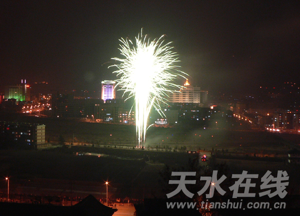 2月12日晚8時,南山前,夜幕上,一團(tuán)團(tuán)火焰驀地騰起,閃電般沖上云霄,空中突然閃現(xiàn)一條百米長的銀色瀑布,天河注水,飛流直下——秦州區(qū)元宵節(jié)焰火晚會在藉河之濱激情開幕,流光溢彩照徹夜空,照亮了數(shù)萬觀眾欣喜的臉龐。