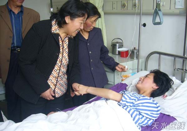 在建二小學(xué)和二十鋪小學(xué),市政府副市長(zhǎng)蕭菡非常關(guān)切地詢(xún)問(wèn)了學(xué)校的受災(zāi)情況及學(xué)生的上學(xué)情況,在教室和臨時(shí)搭建的帳篷里,教學(xué)秩序井然,她首先向在座的小朋友表示了節(jié)日的祝賀!并親切地對(duì)大家說(shuō):在這特殊的節(jié)日,老師一如既往地在堅(jiān)守在工作崗位,孩子仍然勤奮學(xué)習(xí),不受地震的影響,這是一種最大的愛(ài)心和奉獻(xiàn),希望大家同心協(xié)力度過(guò)這個(gè)艱難的時(shí)期。隨后,又赴天水市第一人民醫(yī)院看望慰問(wèn)了平南中學(xué)的住院學(xué)生,黃郁、蕭菡、何道華等領(lǐng)導(dǎo)親切地拉著學(xué)生的手,詳細(xì)詢(xún)問(wèn)了他們傷情的恢復(fù)情況,并鼓勵(lì)他們安心養(yǎng)傷,早日重返校園,同時(shí)還送去了節(jié)日的祝福和禮物。