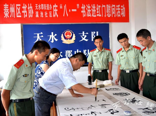 7月30日,秦州區(qū)文聯(lián)組織書畫家一行十余人前往天水郡消防中隊慰問消防官兵。天水郡街道辦事處和瀛池社區(qū)配合并參加了這次活動。
