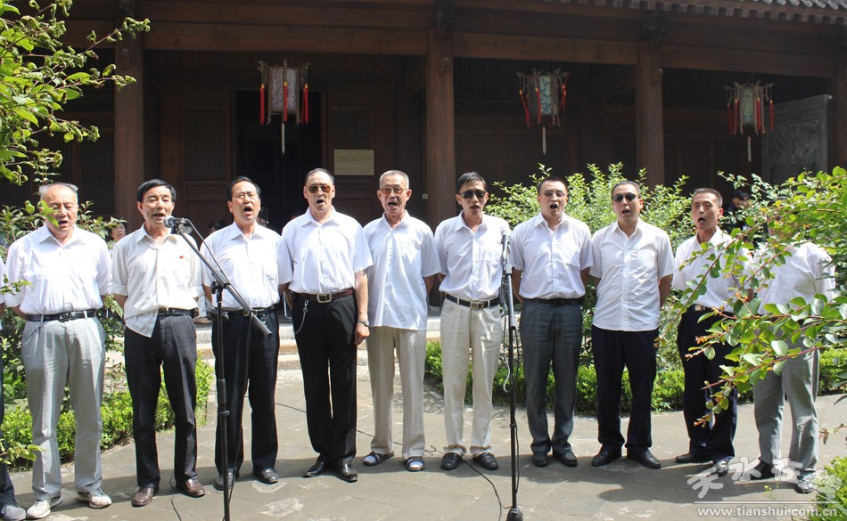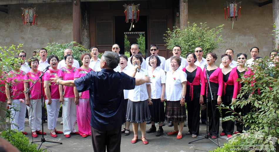 (秦州區(qū)外宣辦 辛志鋒 張永宏) 6月23日上午,天河之聲合唱團(tuán)在市區(qū)景點(diǎn)北宅子為游客演出具有濃郁天水特色的文藝節(jié)目,歡慶公祭伏羲大典和伏羲文化旅游節(jié)。
