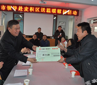 1月27日,在新春佳節(jié)即將來臨之際,天水市政協(xié)副主席王振宇帶領(lǐng)市政協(xié)文史委負(fù)責(zé)人,深入“雙聯(lián)點(diǎn)”秦州區(qū)關(guān)子鎮(zhèn)馮集村,調(diào)研雙聯(lián)和精準(zhǔn)扶貧工作,與村干部商討謀劃今年的幫扶項(xiàng)目,并走訪慰問聯(lián)系戶和特困戶,為他們送去大米、清油等慰問品,祝愿他們過一個(gè)愉快祥和的春節(jié)。