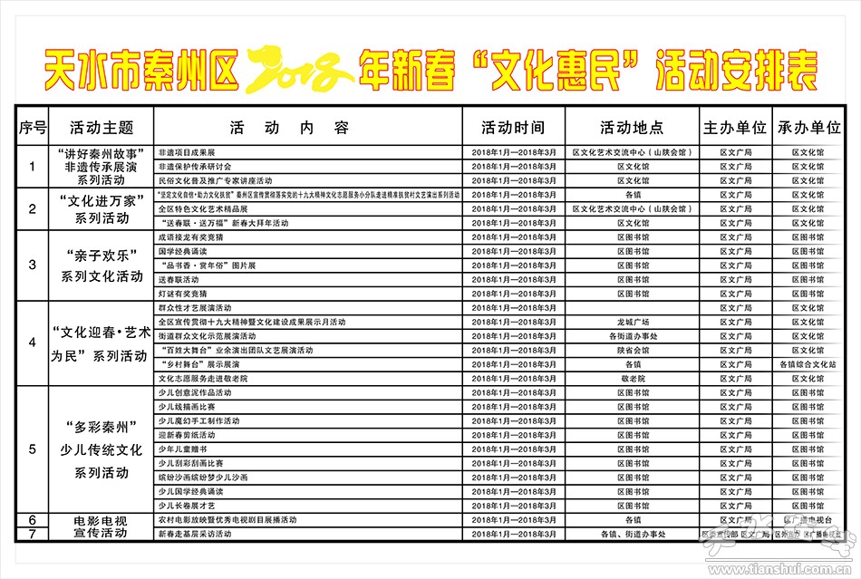 (秦州區(qū)外宣辦 劉可)記者從1月8日召開(kāi)的秦州區(qū)2018年新春文化活動(dòng)安排會(huì)上獲悉,今年新春期間,秦州區(qū)共組織開(kāi)展各類文化活動(dòng)40項(xiàng)。除“貫徹十九大·邁步新征程”秦州區(qū)踐行社會(huì)主義核心價(jià)值觀頒獎(jiǎng)晚會(huì)等6項(xiàng)已開(kāi)展的活動(dòng)外,其余36項(xiàng)活動(dòng)將在1至3月間密集開(kāi)展。這些活動(dòng)中,既有社火匯演、玉泉觀上九廟會(huì)、元宵節(jié)燈展等保留“節(jié)目”,也有迎新春“文藝快閃”、新春年貨花燈節(jié)、青鵑山滑雪品茗、南山云端戶外健身等新“節(jié)目”。