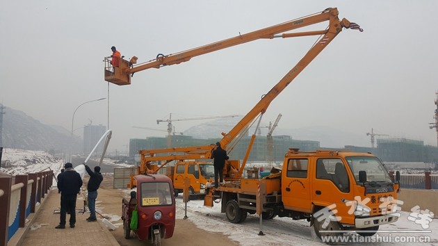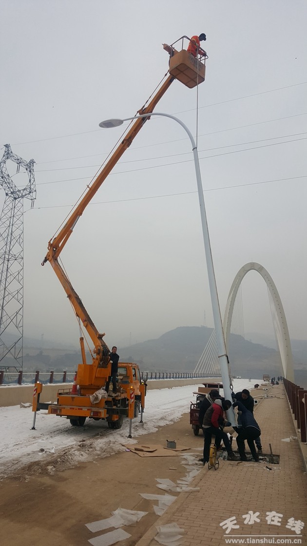 為解決天潤(rùn)橋(原山水一號(hào)大橋)橋梁照明問(wèn)題,秦州區(qū)住建局從2018年1月14日開(kāi)始實(shí)施天潤(rùn)橋路燈安裝工程。相關(guān)人員搶進(jìn)度、保質(zhì)量,放棄雙休日冒嚴(yán)寒戶外高空連續(xù)作業(yè),采用燈位勘察定點(diǎn)、澆筑路燈基座、供電線纜敷設(shè)、燈具組裝吊裝一次性完工的作業(yè)方式安全、規(guī)范、高效施工,力爭(zhēng)1月18日前完成68套單臂路燈安裝,待路燈供電箱變T接、通電調(diào)試后立即投入使用,確保天潤(rùn)橋通車(chē)使用后道路明亮,車(chē)輛行人通行安全方便,切實(shí)發(fā)揮連接西城區(qū)藉河南北兩岸的通道樞紐作用。