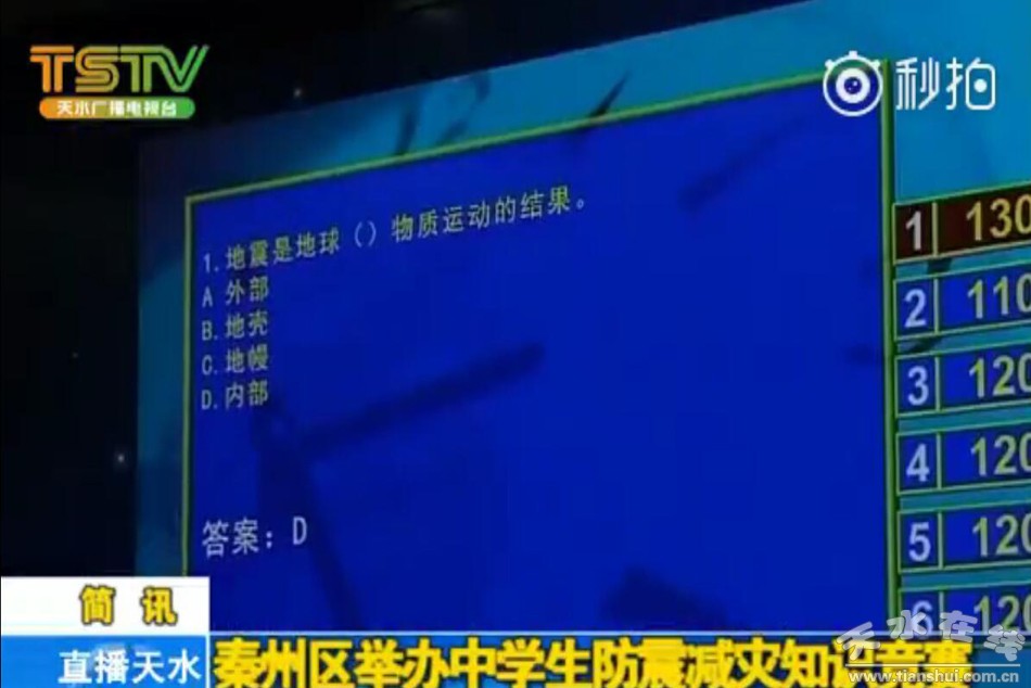 競賽以地震基礎知識、地震應急避險技能、震后自救互助等內容為主,分高中組和初中組兩個組,經過激烈角逐,最終,天水市長城中學和六中分獲初中組和高中組冠軍。