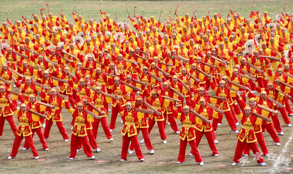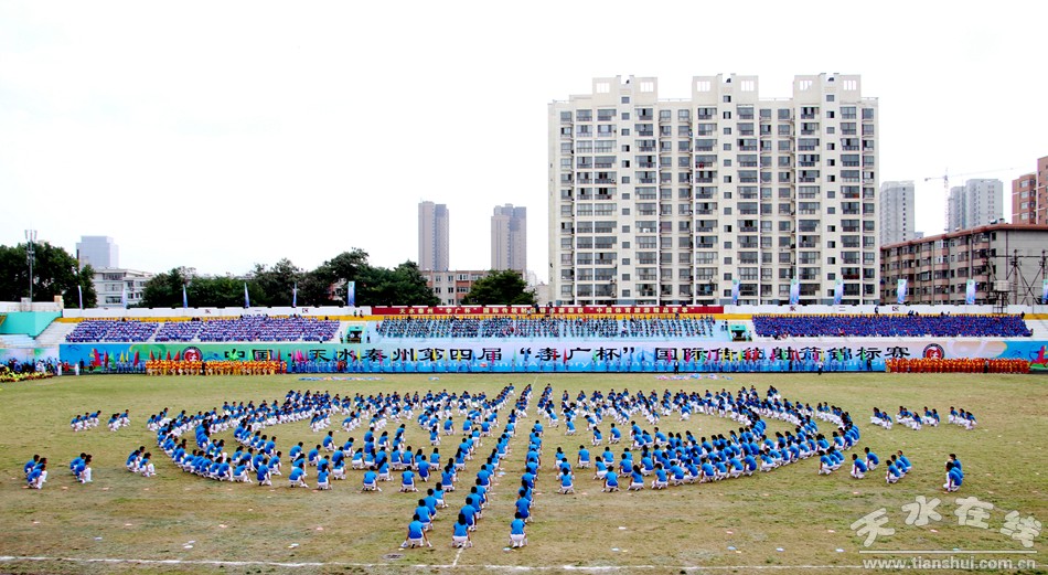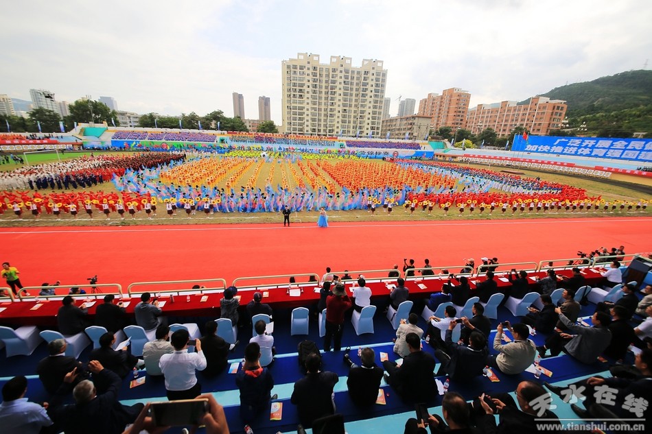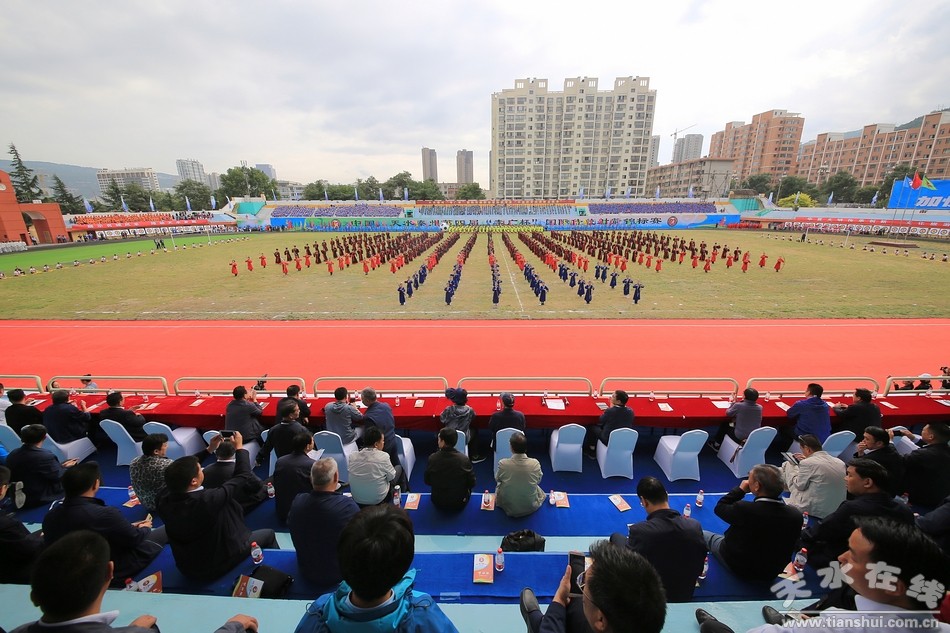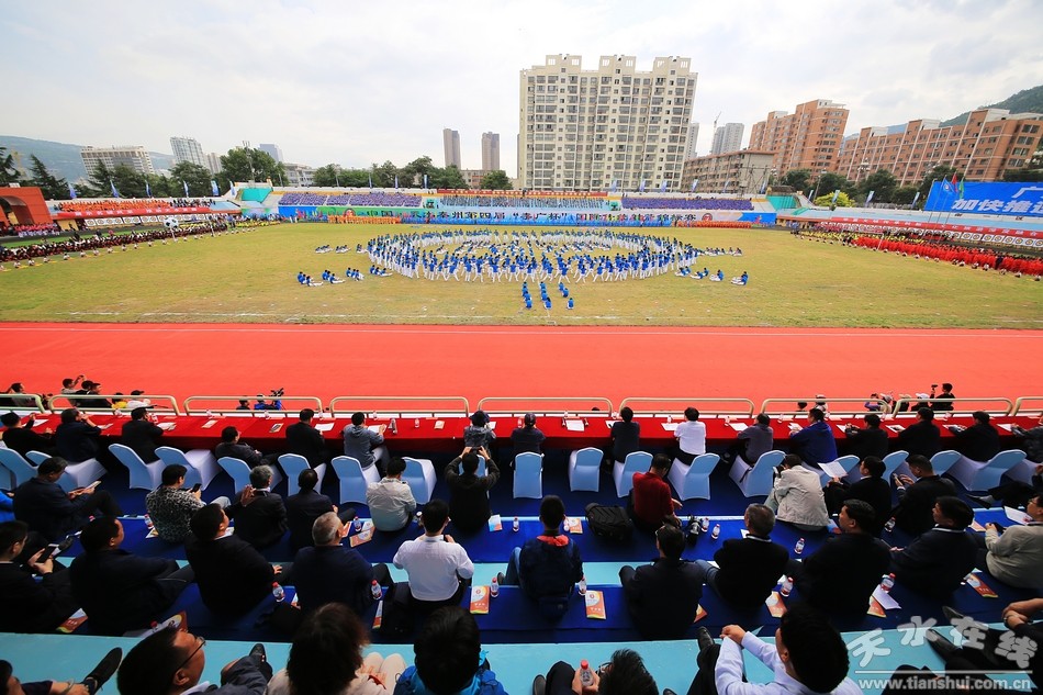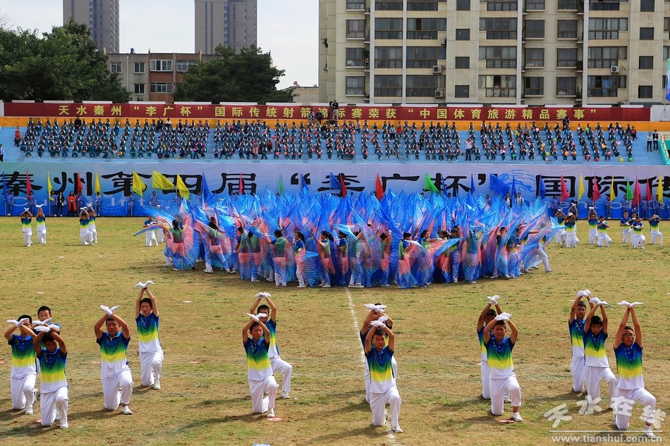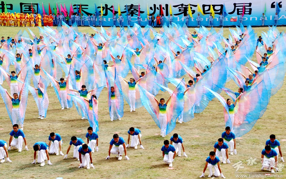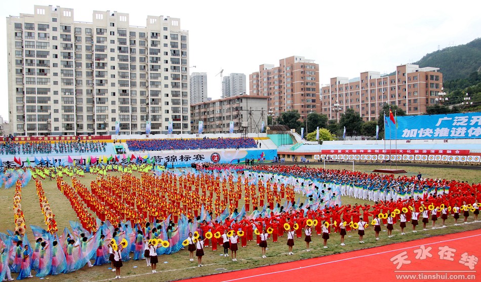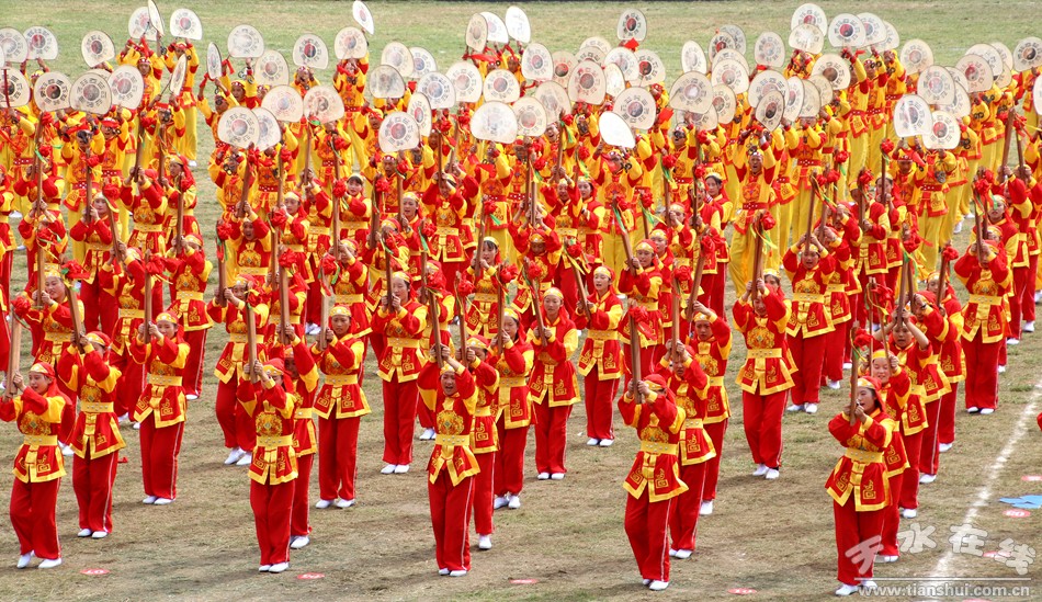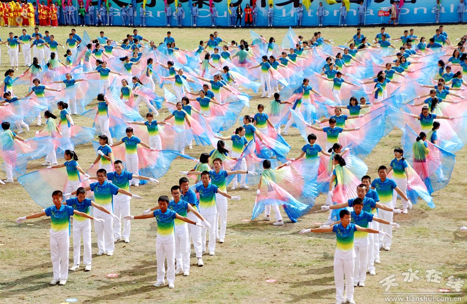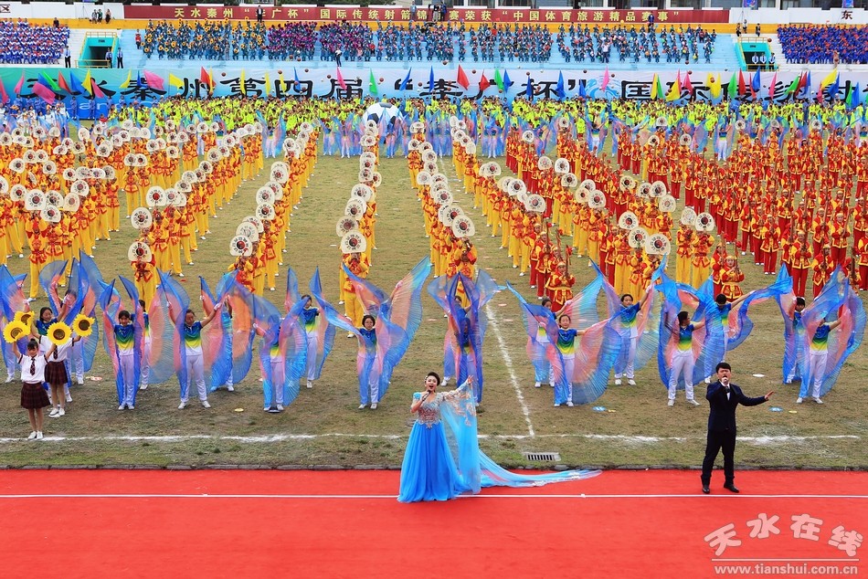 上午10:15開(kāi)幕式全民健身展演活動(dòng)正式開(kāi)始,由3000多名演員組成的5個(gè)表演隊(duì)為大家?guī)?lái)了精彩的文體展演。展演共分為《李廣射禮》、《伏羲太極》、《奔競(jìng)不息》、《激情飛揚(yáng)》、《秦州古韻》、《放飛未來(lái)》6個(gè)篇章。整個(gè)文體展演以磅礴的氣勢(shì)和精彩的表演,把秦州這座古城蓬勃向上、穩(wěn)定發(fā)展的風(fēng)采表現(xiàn)的淋漓盡致,集中展現(xiàn)了大美秦州深厚的歷史文化底蘊(yùn),廣大人民群眾豐富多彩的精神文化生活和積極進(jìn)取開(kāi)拓未來(lái)的精神風(fēng)貌。