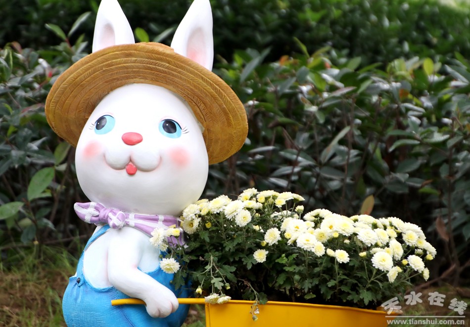 在虛擬養(yǎng)老院門前南北通道處放置10組姿態(tài)各異的造型萌萌兔,木質秋千1組、卡通花樹3組、卡通娃娃5個,以童心、童趣為中心,周圍設置大小、顏色不一的圓形花球,下層以小菊點綴草坪,形成色彩斑斕的“七彩童年”展區(qū)。