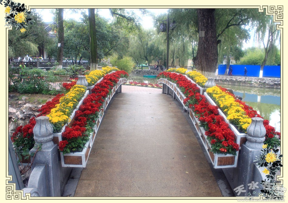公園南側設為竹簡展區(qū),竹簡上鐫刻毛澤東詩詞《沁園春﹒長沙》、《沁園春﹒雪》和《采桑子﹒重陽》,以氣勢磅礴的詩詞彰顯滾滾的歷史長河中,先秦大地,秦墨漢簡的厚重古樸。竹簡前方通道設6面長4m×2.5m的圍墻組合,圍墻為古秦州白墻灰瓦青磚的建筑風格,沿圍墻設置圓形和長方形中國風幾架組合,前方設置白色幾架組合,利用明顯的色差來提高視覺沖擊,用鏤空的中國風幾架與硬質墻體相組合,立體幾架構筑與軟質菊花相結合,相得益彰,渾然天成。