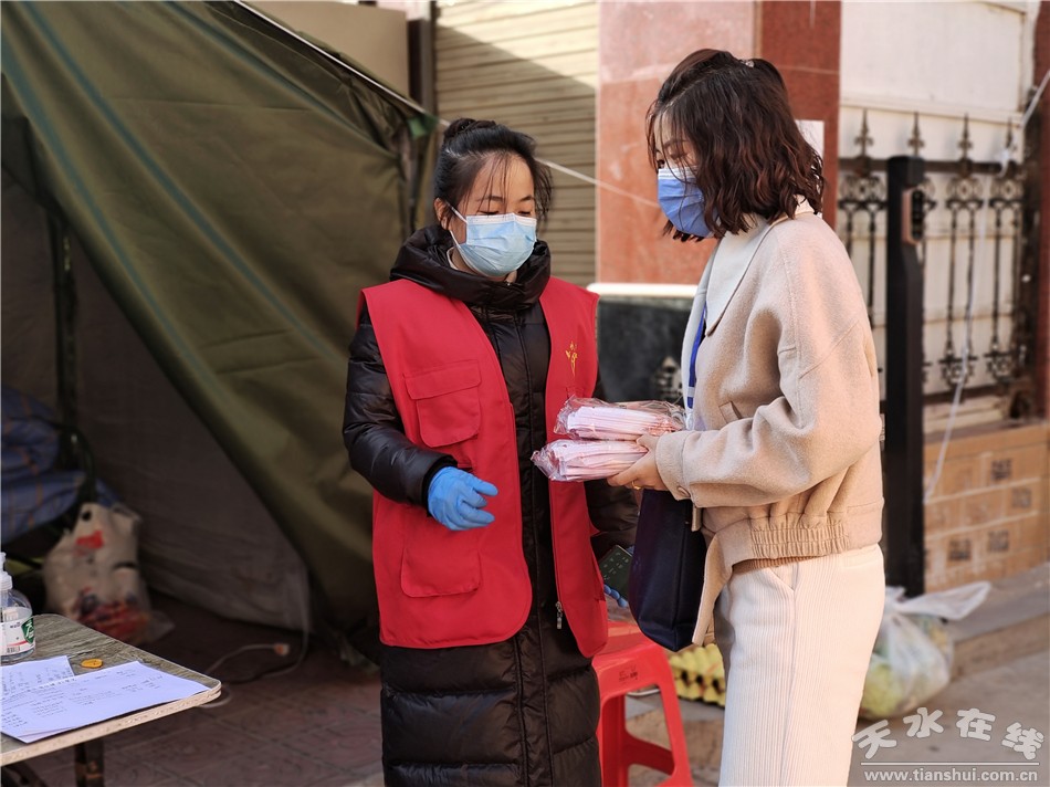 自秦州區(qū)開展大規(guī)模核酸檢測以來,朱秀娟與社區(qū)工作人員每天早上六點(diǎn)半便開始布置場地,組織居民開展核酸檢測,組織志愿者維持秩序,每天都要忙到半夜才能收工。 第四輪全員核酸檢測結(jié)束時已到凌晨一點(diǎn)多,就在朱秀娟和社區(qū)干部打算回家時,接到上級緊急通知稱下一輪核酸檢測要增加醫(yī)務(wù)人員和核酸檢測臺數(shù),需要連夜布置場地。朱秀娟便又連夜組織大家搭帳篷、拉桌子、拉警戒線等,一切收拾就緒已到了三點(diǎn)多,她只在辦公室休息了兩個小時,六點(diǎn)起來又為新一輪核酸檢測做準(zhǔn)備,開始了她一整天的忙碌。“請大家保持一米線距離,提前準(zhǔn)備好健康碼”從第一次核酸檢測以來,這是朱秀娟說得最多的話,也正因?yàn)榇,她的嗓子從一開始便喊沙啞了。