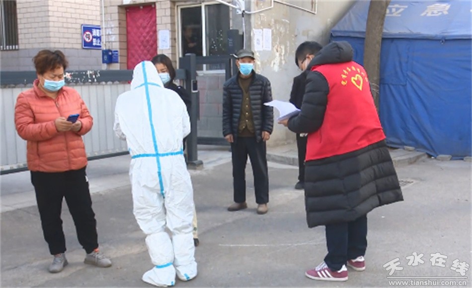 早上七點,在工行家屬院值守點,共青團秦州區(qū)委志愿者拿起喇叭,開始挨家挨戶提醒居民住戶下樓做核酸檢測。現(xiàn)場,他們協(xié)助維持排隊秩序、幫助群眾測量體溫、錄入核酸檢測人員信息等,整個過程高效安全有序。