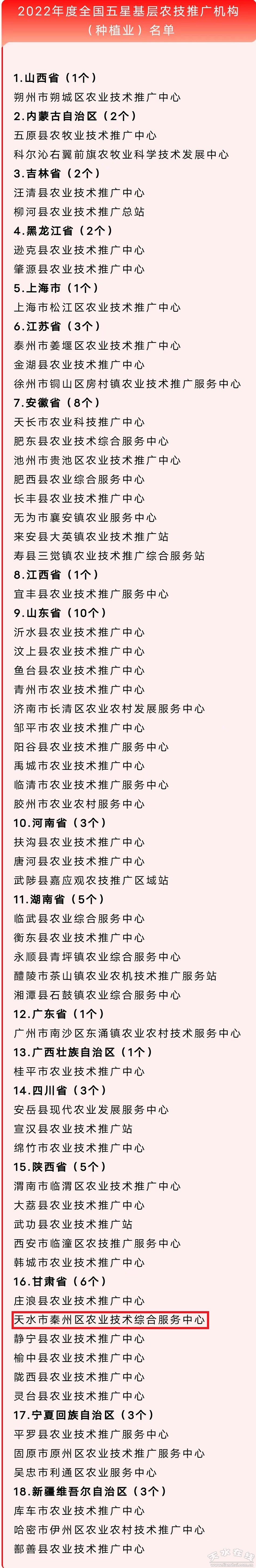 秦州區(qū)融媒體中心2月9日訊 日前,全國(guó)農(nóng)技中心公布了2022年度全國(guó)五星基層農(nóng)技推廣機(jī)構(gòu)(種植業(yè))名單,秦州區(qū)農(nóng)業(yè)技術(shù)綜合服務(wù)中心入選。