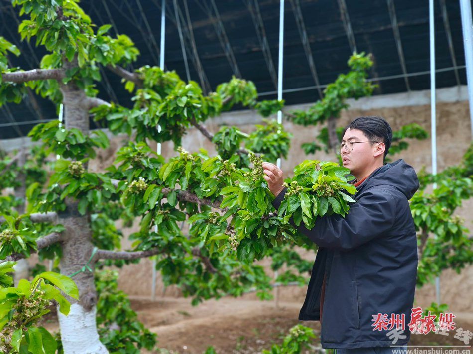 在煙鋪村設(shè)施櫻桃基地,棚外陣陣寒意,棚內(nèi)散發(fā)著花香與泥土的溫潤(rùn)氣息;刎(fù)責(zé)人告訴記者,當(dāng)下正是給不同成長(zhǎng)期的櫻桃進(jìn)行田間管理的關(guān)鍵時(shí)期。記者跟隨他穿梭在三個(gè)棚之間,看到朵朵櫻桃花簇?fù)碓谥︻^,黃豆大小的青果悄然探頭,也能看到像紅寶石一般的櫻桃掛滿枝頭,圓潤(rùn)欲墜,令人垂涎。