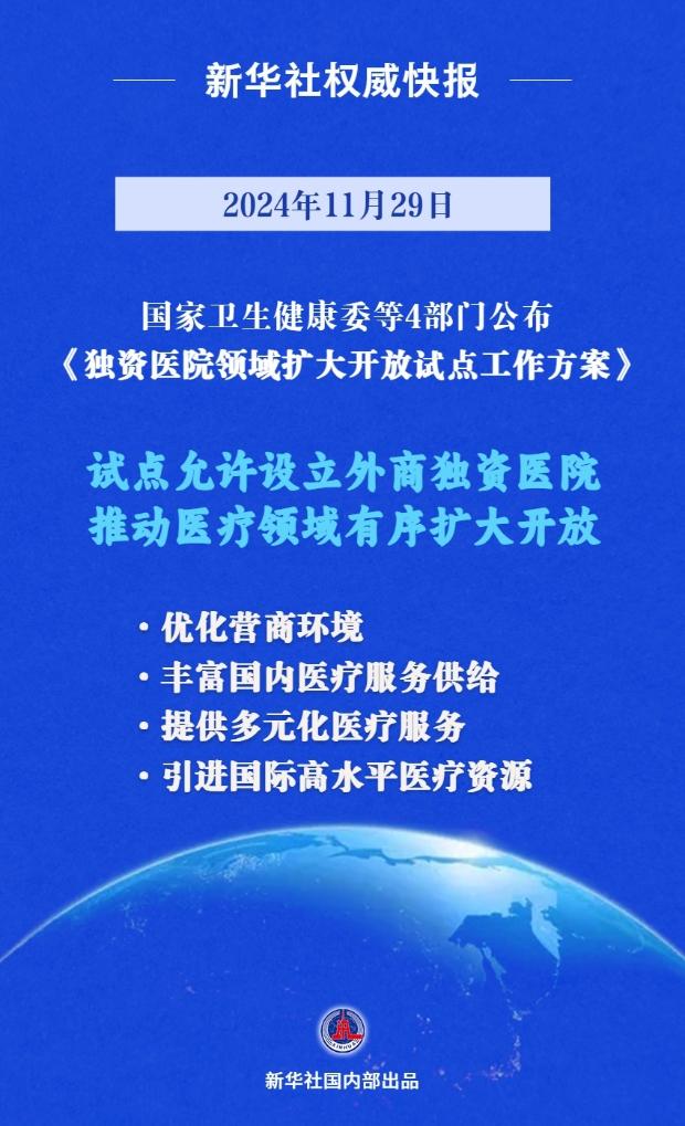 國(guó)家衛(wèi)生健康委、商務(wù)部、國(guó)家中醫(yī)藥局、國(guó)家疾控局4部門印發(fā)的《獨(dú)資醫(yī)院領(lǐng)域擴(kuò)大開放試點(diǎn)工作方案》2024年11月29日公布。
