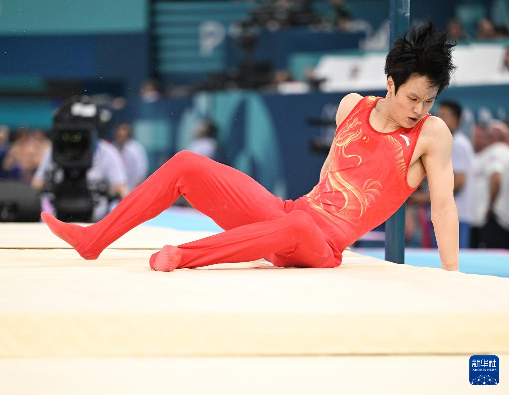 7月29日,中國(guó)隊(duì)選手蘇煒德在單杠比賽中失誤。新華社記者 程敏 攝