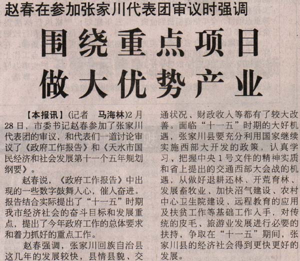 【本報(bào)訊】(記者 馬海林)2月28日,市委書記趙春參加了張家川代表團(tuán)的審議,和代表們一道討論審議了《政府工作報(bào)告》和《天水市國(guó)民經(jīng)濟(jì)和社會(huì)發(fā)展第十一個(gè)五年規(guī)劃綱要》。