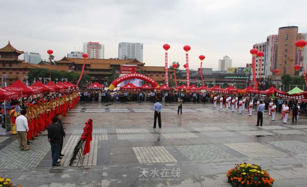天水在線訊 6月21日上午,“天水和諧城鄉(xiāng)游”旅游展示推介會(huì)在該市龍城廣場(chǎng)舉行。展示會(huì)上充滿天水地方文化特色的文藝表演吸引了許多群眾駐足觀看。