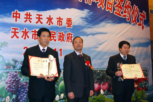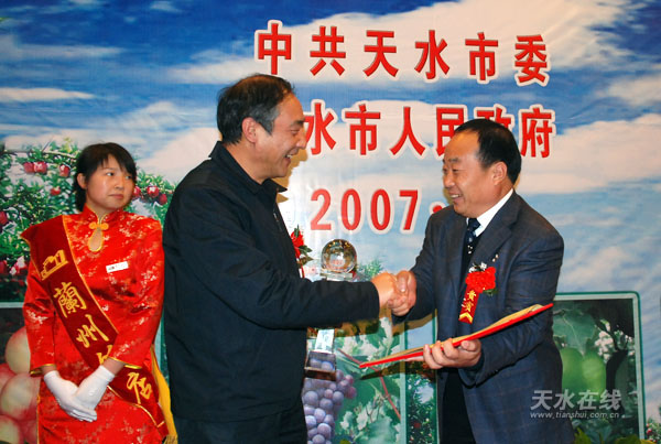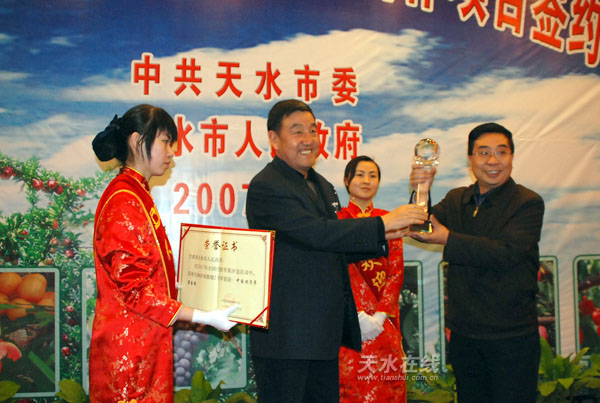 (省人大常委會副主任丁澤生頒發(fā)花牛蘋果“俄矮2號”品種“中國優(yōu)質(zhì)蘋果評選金獎”)