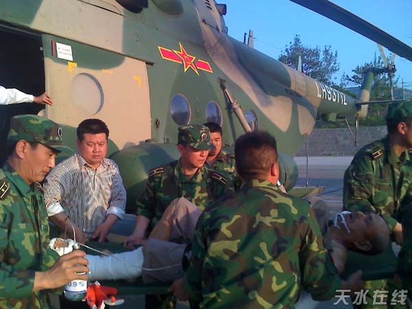 當(dāng)天下午2時(shí)40分,由直升機(jī)從隴南市武都縣轉(zhuǎn)送的4名傷員、汽車從徽縣轉(zhuǎn)送的1名傷員在我市第一人民醫(yī)院接受治療。據(jù)了解,這5名傷員均有不同程度的外傷,其中4名病人病情基本穩(wěn)定,1名病人病情較重,市第一人民醫(yī)院組織了有關(guān)專家全力搶救。