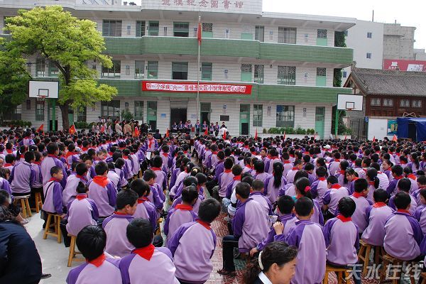 “六一”兒童節(jié)期間,天水市城區(qū)、農(nóng)村的學(xué)校都舉行了慶;顒(dòng)。“六一”前夕,秦州區(qū)9所學(xué)校在解放路第一小學(xué)舉行“手拉手情系地震災(zāi)區(qū)小伙伴”的主題活動(dòng),有300多名少年兒童在此時(shí)加入了少先隊(duì)。他們?cè)谂宕魃硝r艷的紅領(lǐng)巾那一刻,含著熱淚立下誓言,要向戰(zhàn)斗在災(zāi)區(qū)的解放軍、武警官兵、消防戰(zhàn)士、醫(yī)務(wù)工作者和廣大的志愿者學(xué)習(xí),要堅(jiān)強(qiáng)勇敢、自護(hù)自救、拯救生命,要和他們手拉手共渡難關(guān),重建家園,并倡議全區(qū)26000多名少先隊(duì)員寫一封友情書信、制作一份友情卡、捐出一月零花錢、送一份愛心禮物,幫助災(zāi)區(qū)小伙伴。他們立志,要努力學(xué)習(xí),為建設(shè)祖國(guó)做貢獻(xiàn)。