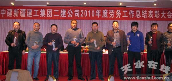 2010年12月17日,天水市人民政府駐新疆辦事處下設(shè)的勞務(wù)基地管理站受到了中建新疆建工集團(tuán)第二建筑公司的表彰,在表彰大會(huì)上,天水市政府駐新疆辦事處主任趙來喜登臺(tái)領(lǐng)獎(jiǎng),天水鼎優(yōu)建筑勞務(wù)公司經(jīng)理王世錄代表全疆勞務(wù)人員做了發(fā)言。天水市受表彰的建筑公司有:天水雙康建筑勞務(wù)有限公司、天水明圓建筑勞務(wù)有限公司、天水鼎優(yōu)建筑勞務(wù)有限公司等三家公司。
