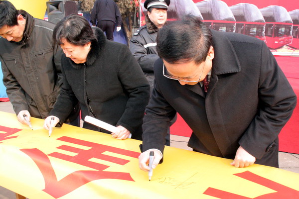 儀式結(jié)束后,市領(lǐng)導(dǎo)帶頭走到簽字臺前,在印有“文明交通、安全春運”字樣的橫幅上簽上了自己的名字。參加儀式的所有人員及車站候車的社會群眾也紛紛走上前來,積極參加了大型簽名活動。
