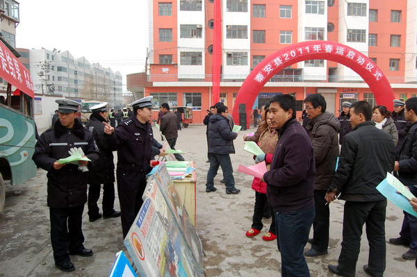 當(dāng)日上午11時,天水交警支隊組織機關(guān)和秦州城區(qū)交警大隊全體民警,聯(lián)合市交通局及運管局、市安監(jiān)局、天嘉運輸集團等單位、企業(yè),在天水客運總站院內(nèi)設(shè)立全市春運啟動儀式主會場,舉行了聲勢浩大的啟動儀式,并開展了以“文明交通,春運安全”為主題的大型簽名和宣傳教育活動。