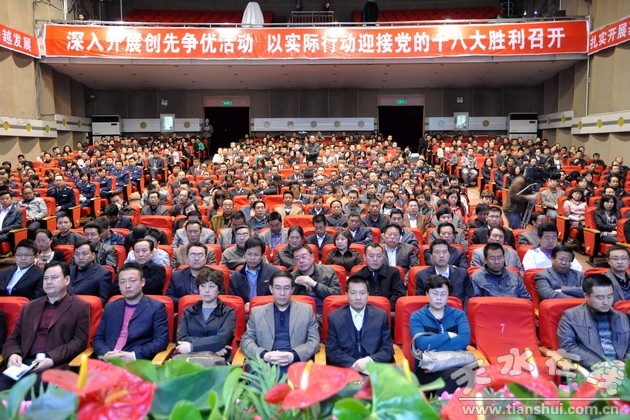 市委常委、市委秘書長蔣曉強主持報告會。市委、各縣(區(qū))創(chuàng)先爭優(yōu)活動領(lǐng)導(dǎo)小組成員,縣(區(qū))委宣傳部分管副部長,市委各部委辦、市直及駐市有關(guān)單位黨組織負(fù)責(zé)人及黨員干部代表,秦州、麥積兩區(qū)部分鄉(xiāng)鎮(zhèn)、村和街道、社區(qū)黨組織負(fù)責(zé)人共計700多人在秦州大劇院聆聽了報告。