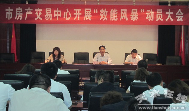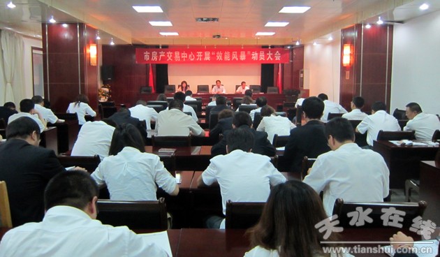 2012年6月28日下午,天水市房地產(chǎn)產(chǎn)權(quán)交易管理中心召開效能風(fēng)暴行動(dòng)動(dòng)員大會(huì)。會(huì)議傳達(dá)了全市效能風(fēng)暴動(dòng)員大會(huì)精神。市房管局副局長、交易中心主任蘇定賢主持會(huì)議并作了動(dòng)員講話。