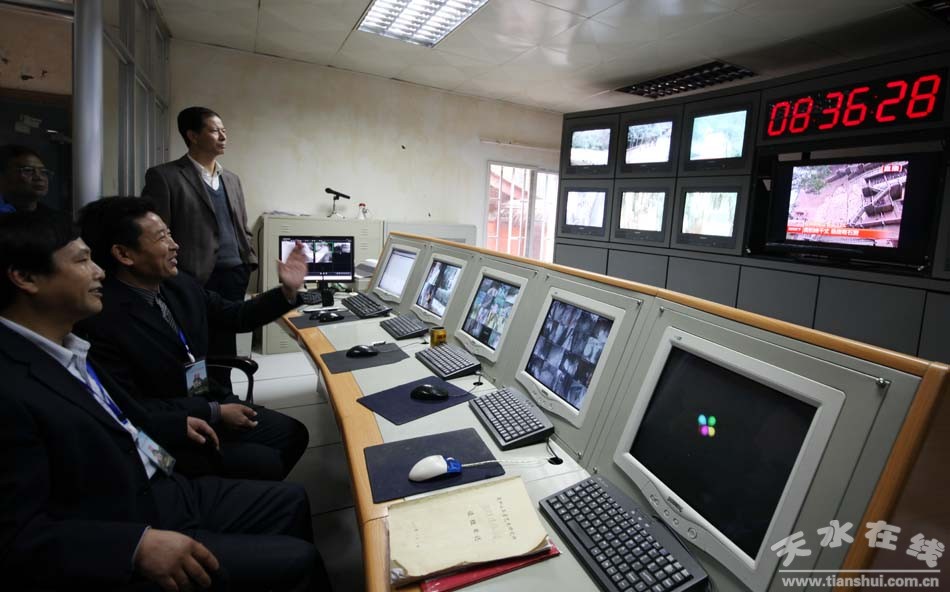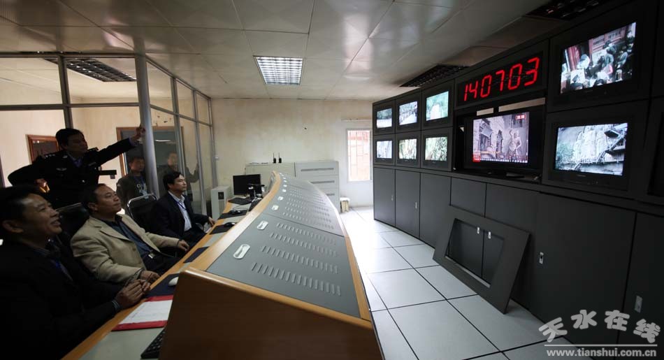 (市公安局常務(wù)副局長李海成,市委外宣辦、市政府新聞辦主任劉越高,麥積山風(fēng)景名勝區(qū)管委會(huì)主任馬兆讓、副主任李龍等在麥積山石窟監(jiān)控室觀看中央電視臺(tái)新聞?lì)l道現(xiàn)場(chǎng)直播麥積山旅游情況畫面。)