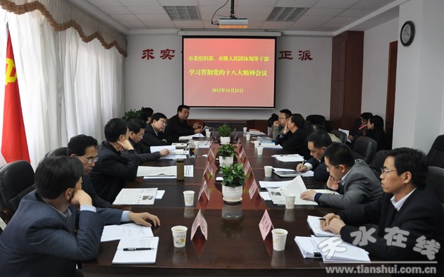 11月21日下午,天水市委常委、組織部長王光慶主持召開市委組織部和市級人民團(tuán)體領(lǐng)導(dǎo)干部學(xué)習(xí)黨的十八大精神會議,就學(xué)習(xí)貫徹落實黨的十八大精神進(jìn)行安排部署。王光慶在會上強(qiáng)調(diào),要把學(xué)習(xí)領(lǐng)會黨的十八大精神作為當(dāng)前和今后一個時期的首要政治任務(wù),帶頭學(xué)、深入學(xué),自覺把思想統(tǒng)一到十八大精神上來,并以十八大精神為指導(dǎo),緊密聯(lián)系工作實際,扎實做好各項重點工作,科學(xué)謀劃好明年的組織工作和群團(tuán)工作。