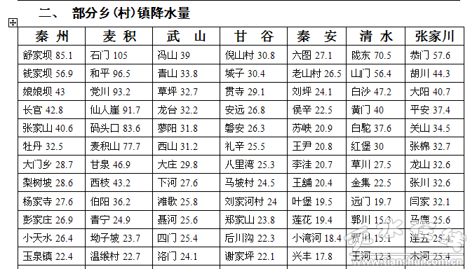 受高空下滑冷空氣和副熱帶高壓外圍西南暖濕氣流的共同影響,6日傍晚開始,我市出現(xiàn)大范圍雷陣雨天氣,截止7日8時,全市普降中到大雨,最大降水量出現(xiàn)在麥積區(qū)石門,達105毫米。