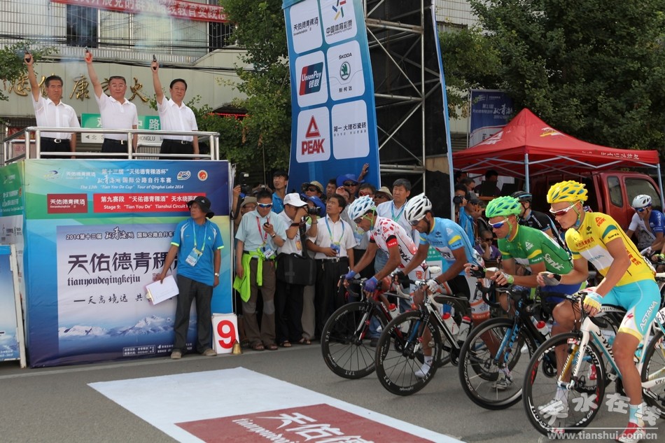賽前,天水市政府舉行了隆重的發(fā)車儀式。天水繞圈賽賽程全長118公里,共十圈。途中共有3個沖刺點,分別在第三圈、第五圈和第七圈,共有131名選手參加比賽。上午9:30,比賽正式開始。