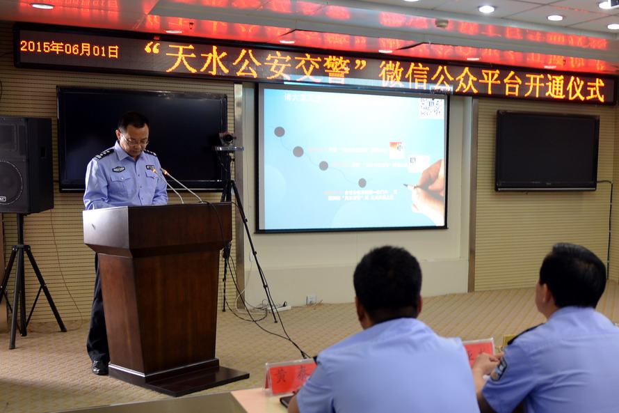 開通儀式上,支隊政委毛建民宣讀了省公安廳交管局發(fā)來的賀信,副支隊長強亞龍主持儀式并就學(xué)習(xí)利用微信公眾平臺開展宣傳工作作了動員講話,法制宣傳科科長趙光皓對“天水公安交警”微信公眾平臺進行了現(xiàn)場演示推介。支隊在家領(lǐng)導(dǎo)、機關(guān)全體民警,各縣區(qū)和卦臺山、機動10個基層交警大隊分管領(lǐng)導(dǎo)、宣傳工作人員參加了開通儀式。