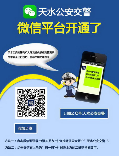 為順應(yīng)當(dāng)今新媒體時代發(fā)展的需求,填補全市公安交警系統(tǒng)自媒體微信宣傳陣地的空白,由天水交警支隊創(chuàng)辦的“天水公安交警”微信公眾平臺于2014年底完成注冊、2015年3月完成認證、6月1日完成測試并正式開通,是繼支隊門戶網(wǎng)站——“天水交警”網(wǎng)、支隊官方警務(wù)微博——“天水交警”新浪微博和“天水公安交警”騰訊微博、支隊手機短信告知系統(tǒng)之后又一個重要的宣傳平臺。該平臺以“發(fā)布天水交警資訊、展現(xiàn)天水交警形象,提示安全出行信息、倡導(dǎo)文明交通理念,提供網(wǎng)上便民服務(wù)、搭建警民聯(lián)系橋梁”為宗旨,開設(shè)了“微發(fā)布”、“微提示”、“微應(yīng)用”3個一級欄目。其中,“微發(fā)布”現(xiàn)設(shè)“工作動態(tài)”、“通知公告”2個子欄目,“微提示”現(xiàn)設(shè)“安全提示”、“交通法規(guī)”2個子欄目,“微應(yīng)用”鏈接“新浪微博”、“騰訊微博”、“網(wǎng)上查詢”等內(nèi)容。它的正式開通將成為推動天水公安交通管理和道路交通安全宣傳工作一個嶄新的、重要的平臺。