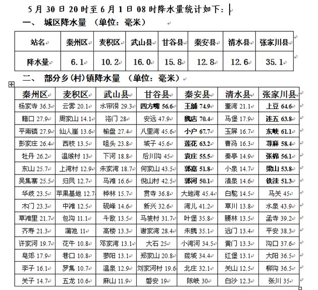 受新疆下滑的冷空氣和高原暖濕氣流的共同影響,5月31日凌晨開始,我市出現(xiàn)入汛以來最強的降水過程,甘谷縣的北部、秦安縣的中北部和張家川縣的北部等鄉(xiāng)鎮(zhèn)出現(xiàn)暴雨,最大降水量出現(xiàn)在秦安的王舖,達74.9毫米。