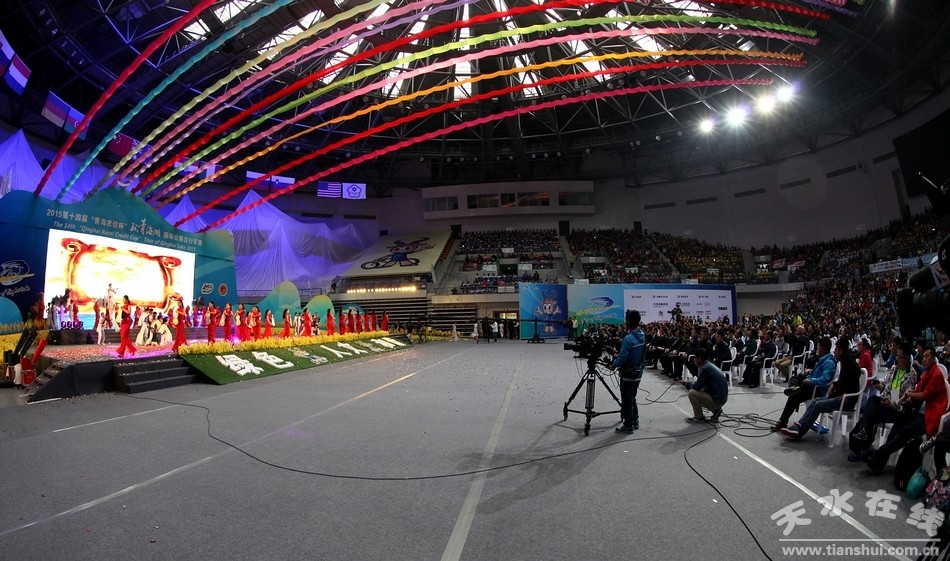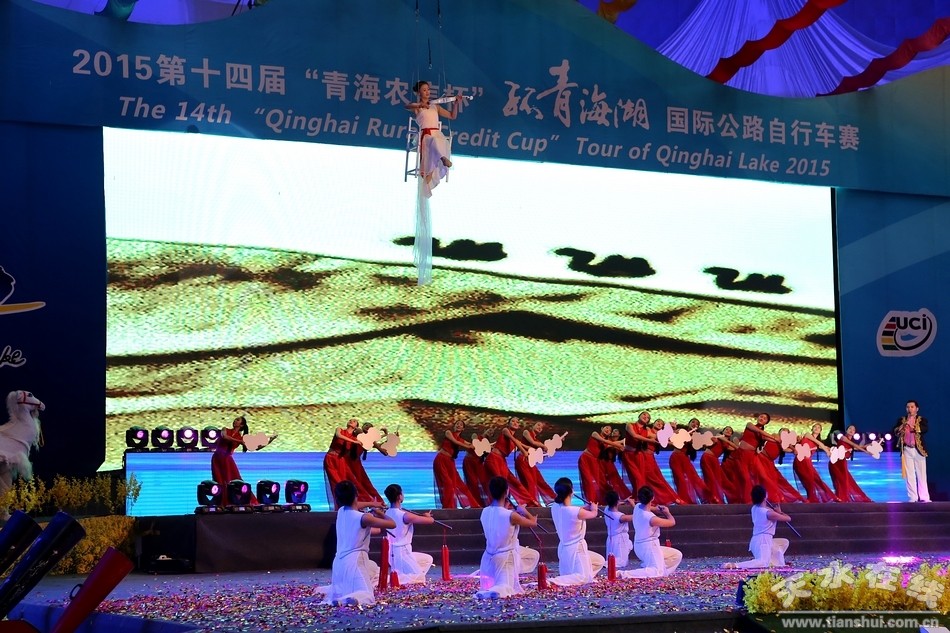 開幕式上富有民族特色的文化表演,通過組合式情景展示、情景表演、大型時(shí)裝表演等藝術(shù)表現(xiàn)形式,再現(xiàn)了2000多年前古絲綢之路壯麗的景觀和21世紀(jì)“一帶一路”的宏偉構(gòu)想。開幕式現(xiàn)場通過優(yōu)美的音樂旋律和LED大屏的全景展示和大歌舞表演,向全世界彰顯環(huán)湖賽壯觀的場面和13年走過的歷程,讓觀眾直奔主題。組委會還特別邀請了星光大道獲獎組合“五洲唱響”演唱《騰飛朋友》,體現(xiàn)了國際元素。
