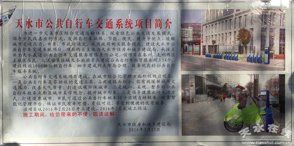 2月29日,天水市公共自行車項(xiàng)目在秦州區(qū)西關(guān)開(kāi)始動(dòng)工建設(shè),這是天水市繼大力推廣新能源公交車之后,在發(fā)展城市綠色交通方面又一重要舉措。據(jù)悉,同期開(kāi)工建設(shè)的公共自行車站點(diǎn)還有文廟等地。