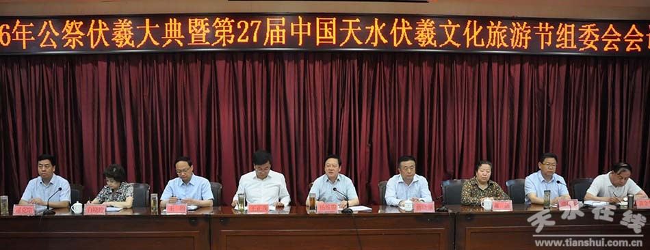 6月7日,2016(丙申)年公祭中華人文始祖伏羲大典暨第二十七屆中國天水伏羲文化旅游節(jié)組委會召開第一次全體會議,貫徹落實省公祭伏羲大典活動領(lǐng)導(dǎo)小組會議精神,安排部署今年節(jié)會籌備工作。市委副書記、市長楊維俊強調(diào),各級各相關(guān)部門要進一步增強大局意識、責(zé)任意識,主動參與,迅速行動,以嚴謹?shù)膽B(tài)度、扎實的作風(fēng)做好各項籌備工作,確保今年節(jié)會活動取得圓滿成功。