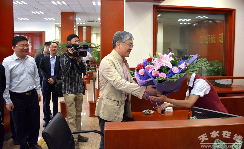 (浙商銀行總行行長劉曉春在浙商銀行天水分行調(diào)研,圖為為優(yōu)秀員工獻花。)