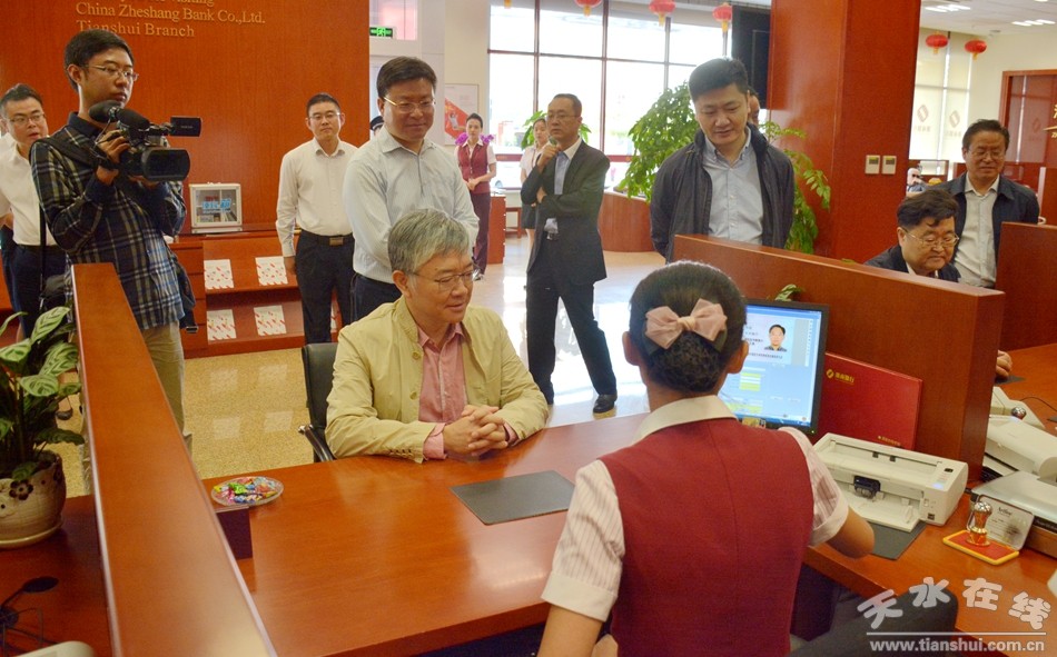 (浙商銀行總行行長劉曉春在浙商銀行天水分行調(diào)研,圖為現(xiàn)場辦理銀行卡。)