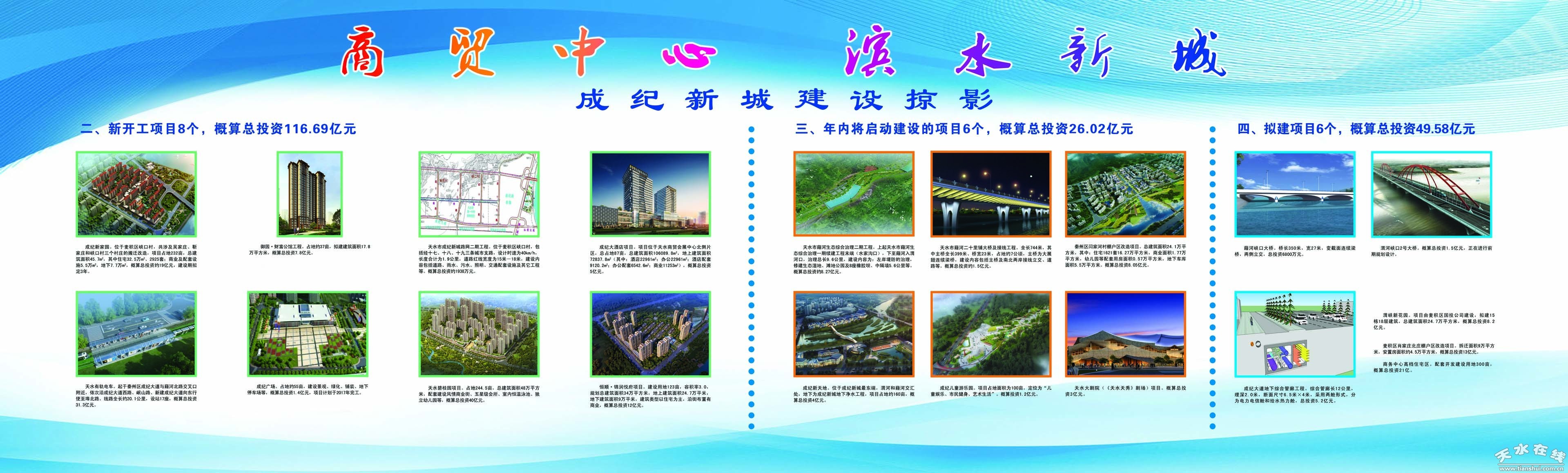 成紀(jì)新城位于天水市東西向段中心位置,東起渭河,西以藉河七里墩天巉公路橋?yàn)榻,南以秦麥高速為界,北至北山脊線,包括秦州區(qū)閆家河灣至麥積區(qū)峽口藉河河道及以北區(qū)域(含北山南麓),規(guī)劃面積17.6平方公里,一期規(guī)劃面積9.5平方公里(其中規(guī)劃建設(shè)用地6000畝,北山生態(tài)公園占地8250畝),是天水發(fā)展商貿(mào)會(huì)展、房產(chǎn)開(kāi)發(fā)、科教文化、旅游產(chǎn)業(yè)、體育產(chǎn)業(yè)的重要功能區(qū)和城市中央商務(wù)區(qū)。目前,新城內(nèi)已啟動(dòng)實(shí)施億元以上的項(xiàng)目35個(gè),總投資256.21億元。其中已建成和在建的項(xiàng)目23個(gè),主要包括:成紀(jì)大道及防洪綜合治理工程、成紀(jì)大道高架橋、藉河孫家坪大橋、渭河峽口1號(hào)大橋、天水會(huì)展中心、天水文化藝術(shù)館、天水商貿(mào)城系列場(chǎng)館、成紀(jì)廣場(chǎng)、天水一中麥積分校、天水市體育中心、天水有軌電車(chē)、藉河羅家溝大橋及接線工程、成紀(jì)新城地下凈水工程、成紀(jì)新城一期路網(wǎng)工程、成紀(jì)新城二期路網(wǎng)工程、北山生態(tài)園、成紀(jì)新家園、成紀(jì)?漆t(yī)院綜合樓、隴上尊裕、御園•財(cái)富公館、天水碧桂園、恒順•錦潤(rùn)悅府、成紀(jì)大酒店等項(xiàng)目;啟動(dòng)前期工作即將動(dòng)工建設(shè)的項(xiàng)目6個(gè):主要包括藉河二十里鋪大橋及接線工程、藉河生態(tài)綜合治理二期工程、秦州區(qū)閆家河村棚戶區(qū)改造項(xiàng)目、成紀(jì)新天地、天水大劇院(《天水天秀》劇場(chǎng))、成紀(jì)兒童游樂(lè)園等項(xiàng)目;擬建項(xiàng)目6個(gè):主要包括藉河峽口大橋、渭河峽口2號(hào)大橋、成紀(jì)大道地下綜合管廊工程、麥積區(qū)肖家莊北莊棚戶區(qū)改造項(xiàng)目、商務(wù)中心高檔住宅區(qū)、渭峽新花園等項(xiàng)目。