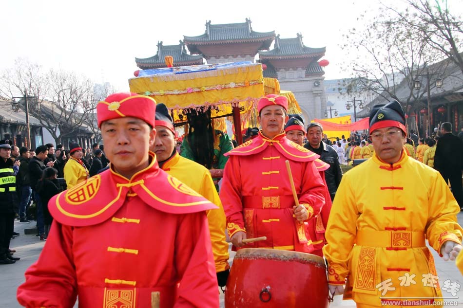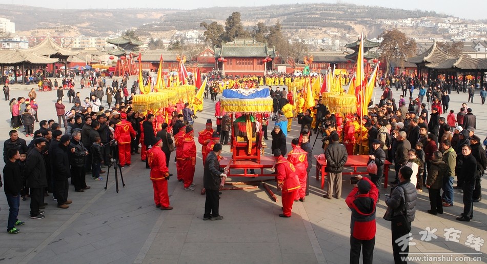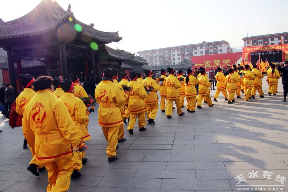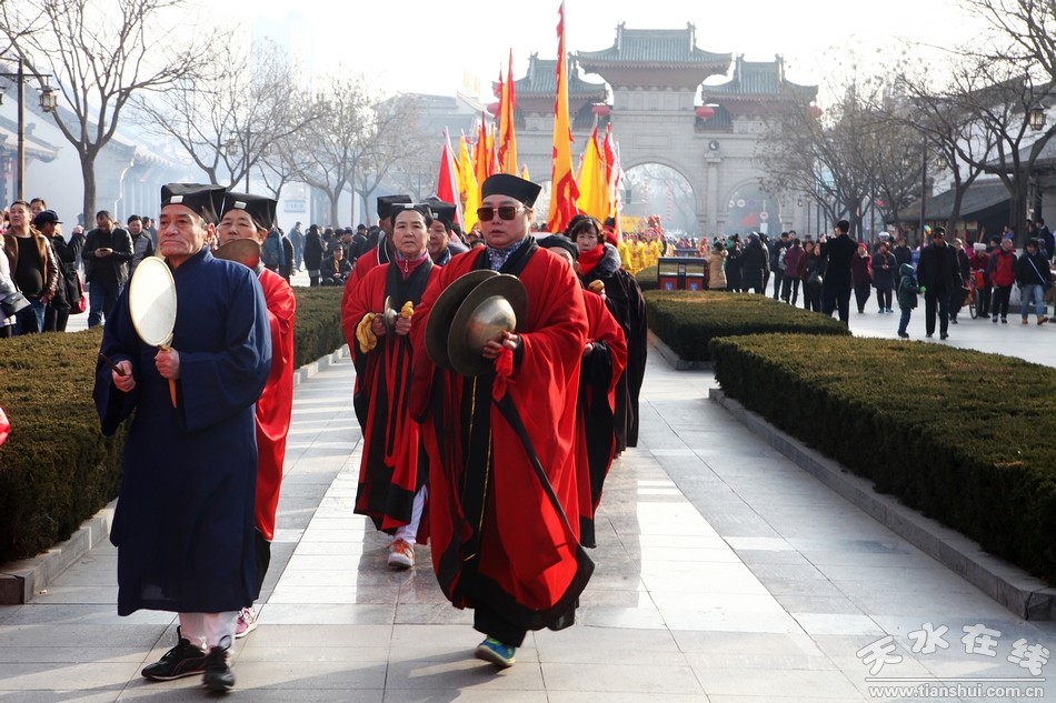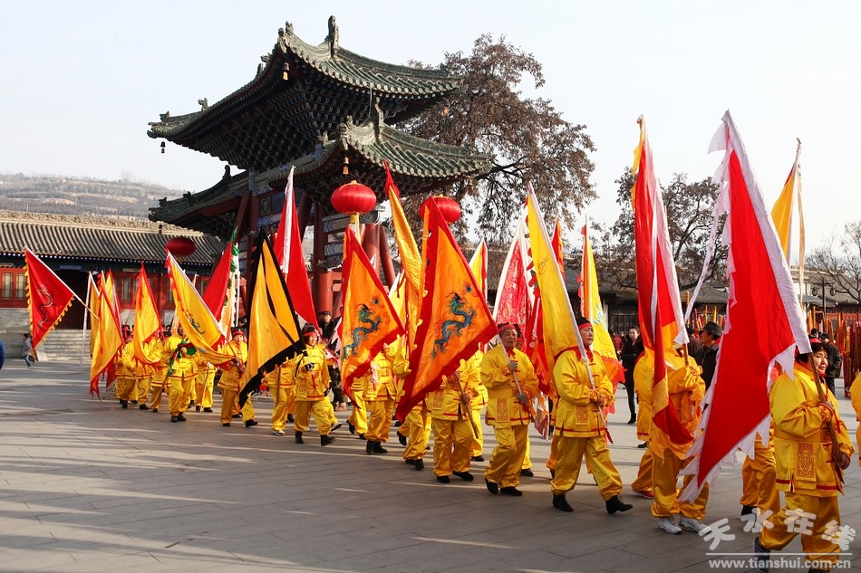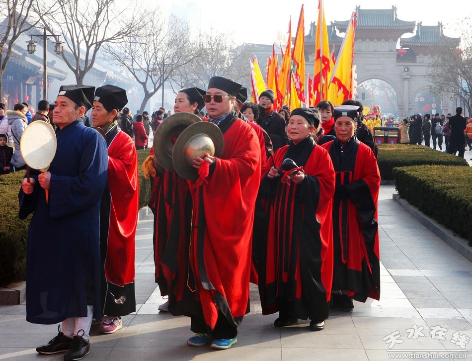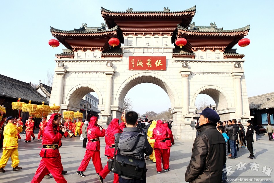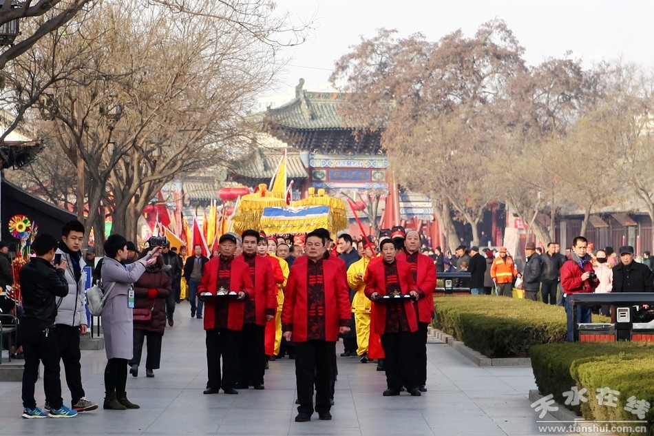2月9(農(nóng)歷正月十三)日,吉祥中華—丁酉(2017)年天水伏羲廟春祭伏羲活動(dòng)舉行祈福納祥迎圣水儀式。取水供圣儀式結(jié)束后,在伏羲廟大門(mén)對(duì)面的戲樓前舉行了出榜文儀式。之后,方神黑爺像在浩浩蕩蕩儀仗隊(duì)伍的“護(hù)駕”下“巡游”伏羲城。
