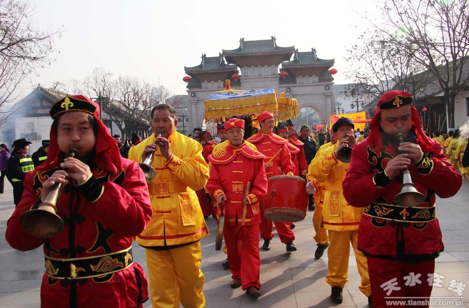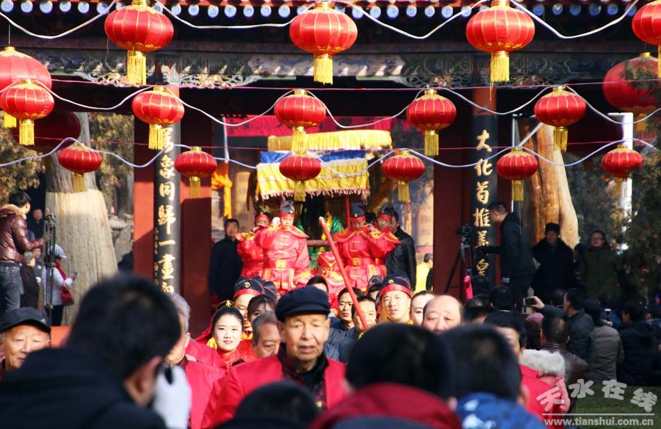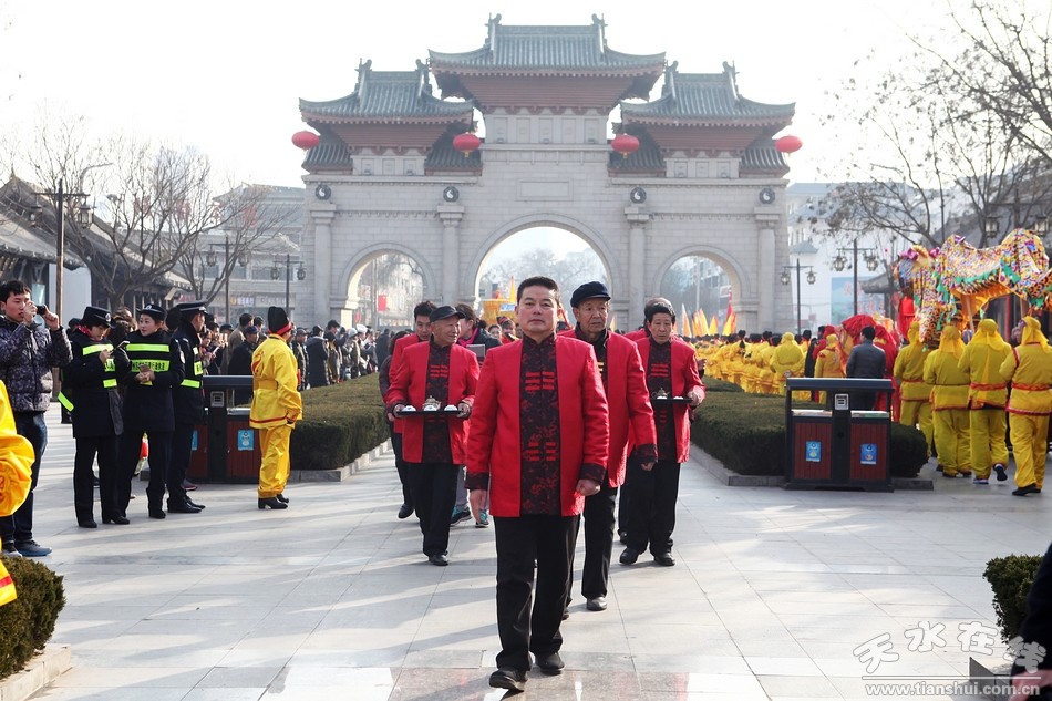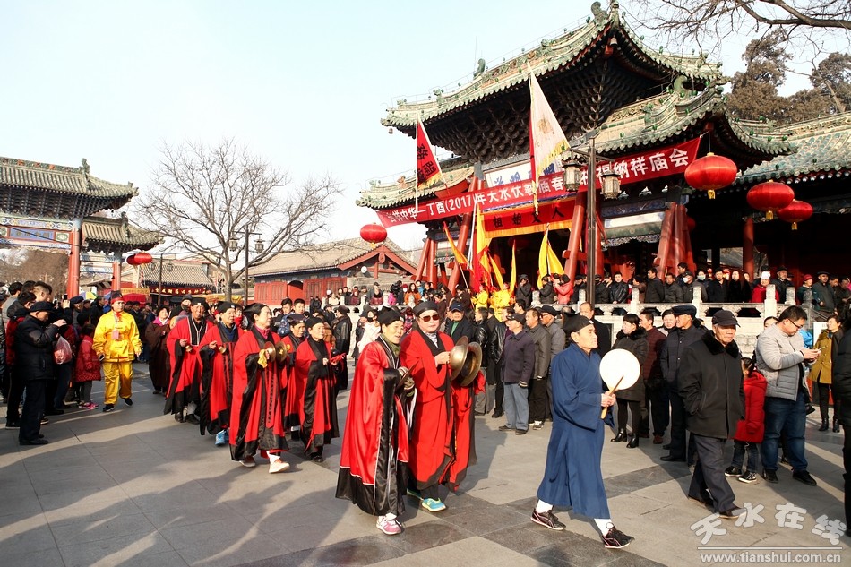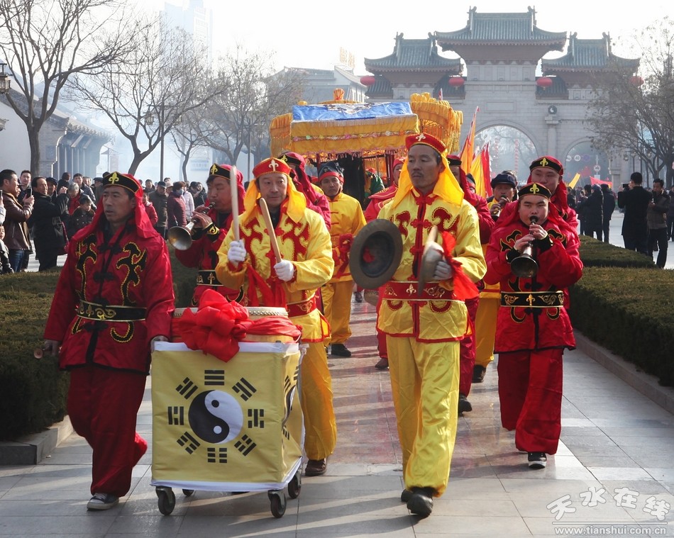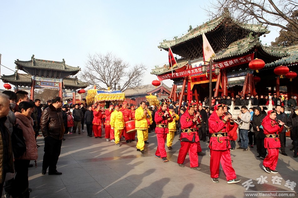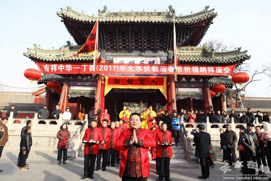 2月9(農(nóng)歷正月十三)日,吉祥中華—丁酉(2017)年天水伏羲廟春祭伏羲活動(dòng)舉行祈福納祥迎圣水儀式。取水供圣儀式結(jié)束后,在伏羲廟大門(mén)對(duì)面的戲樓前舉行了出榜文儀式。之后,方神黑爺像在浩浩蕩蕩儀仗隊(duì)伍的“護(hù)駕”下“巡游”伏羲城。