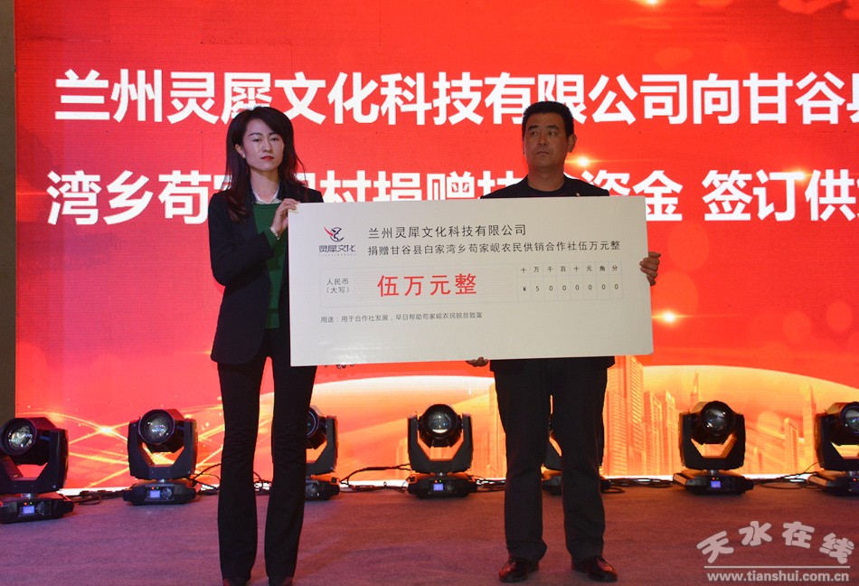 交付儀式上,蘭州靈犀文化科技有限公司向甘谷縣白家灣鄉(xiāng)茍家峴村捐贈(zèng)了扶貧資金,簽訂了定點(diǎn)供貨協(xié)議。