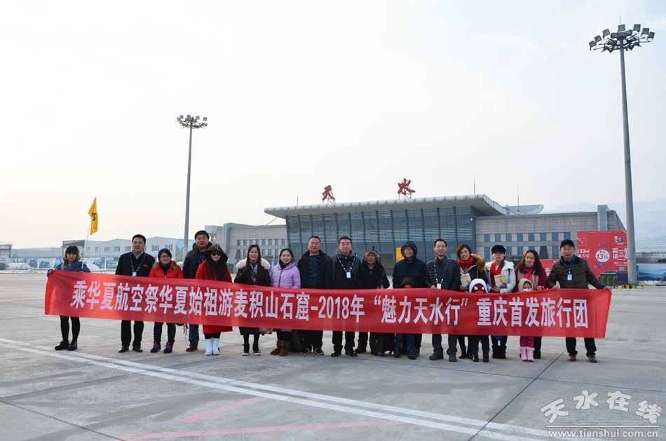 1月12日,隨著華夏航空班機(jī)的緩緩滑落,從重慶飛來(lái)的旅行團(tuán)隊(duì)抵達(dá)天水機(jī)場(chǎng),正式開(kāi)啟2018“魅力天水行”。由天水市文化和旅游局副局長(zhǎng)傅小春、天水春秋旅行社、華夏航空和天水機(jī)場(chǎng)共同組成的接機(jī)團(tuán),為“乘華夏航空 祭華夏始祖 游麥積山石窟——2018年‘魅力天水行’”的重慶首發(fā)旅行團(tuán)贈(zèng)送了《天水旅游》作為指南。